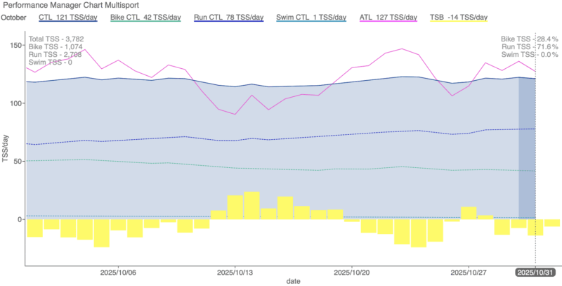 ランに注力してたので、ランのCTLが12ptも上昇、バイクは減、スイムは一回も泳いでないので当然減。