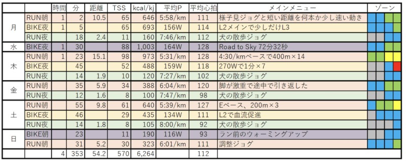 RUN:日中はずっと脚は重いままで夜に犬の散歩ジョグ。ただ走り出すと朝のような重さはなかった。まぁペースが朝よりずっと遅いけど・・・。12分:1.6km/8rTSS。