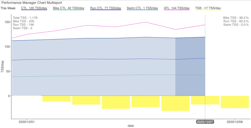 7月までCTLが下がり続けたので、体調が良くなっても低いCTLではやれる練習量は限られており、60だったCTLを徐々に徐々に4ヶ月かけて120まで上げたけど、繁忙期でまた下がって、閑散期に入ってまた120まで戻ってきた感じ。