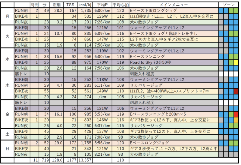 グレーのL1や水色のL2ばかりで高強度はおろか中強度すらほぼやってませんでした。まぁ今の時期はボリューム重視なのでこれはこれでいいんですけどね。
