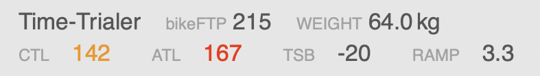 CTLは7pt上昇。週間CTLは5ptまでの上昇に留めるという自己規律がありますが、上がったのはバイクで・・・バイクのCTLが37と低すぎるので、ちょっと練習しただけでTSSを稼いでしまい、結果CTLが上がってしまう。