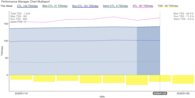 今週は今季最強&最長の寒波襲来で週を通して寒いし、風が強い・・・なんてもんじゃない爆風の日が多かった。そんな中でもランはきっちり練習できたし、過去最高の102CTLまで積み上げられたので出来としては良かった。
