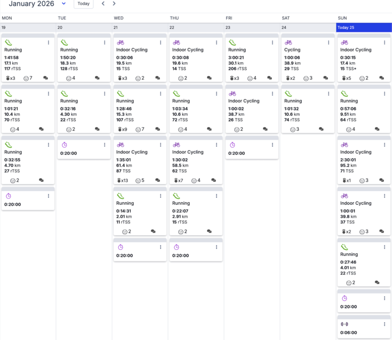 またランのCTLが102まで積み上がったことで、ランに重きを置いていた練習を今週からバイクへとシフト。その脚慣らしといった感じで低強度で長い時間乗ることから始めた。いきなり長時間はメンタルが保たないので細切れだけど、とにかく1日のトータルの乗車時間を長くすることから開始。それもまずまずのスタートは切れたと思う。