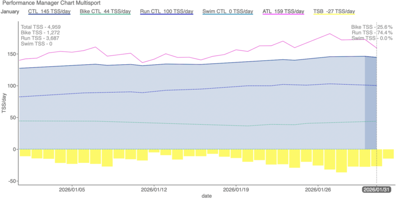 2月も引き続き仕事は閑散期。練習時間はたっぷり取れるはずなので体調に気をつけながら積み上げていきたい。そしてランのCTLが100に達したことでランは一旦置いておく。来月からはバイクに重きを置いてやっていくつもり。