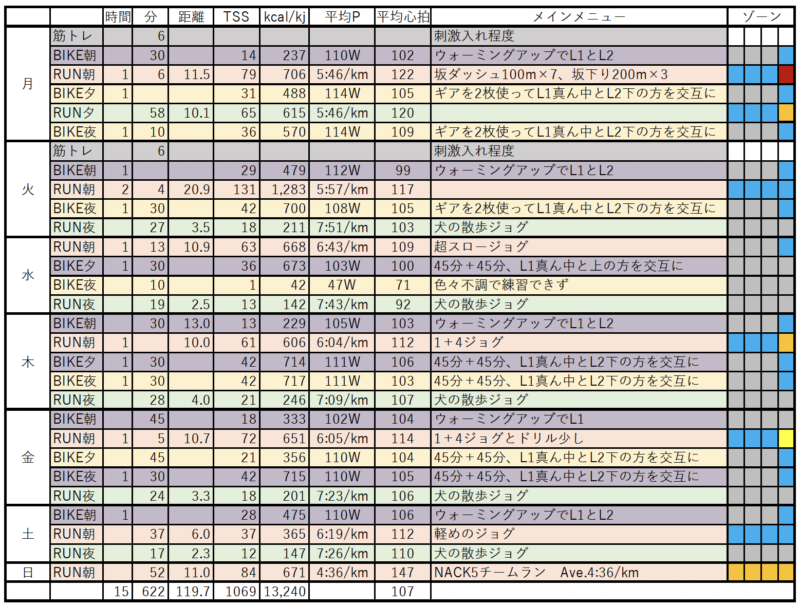 基礎構築期ですが今週はさらにグレー(L1)の量が増え水色(L2)を逆転。まぁ基礎構築期前半の終盤戦ということでランの疲労が蓄積し、バイクがほぼL1だったからしょうがない。