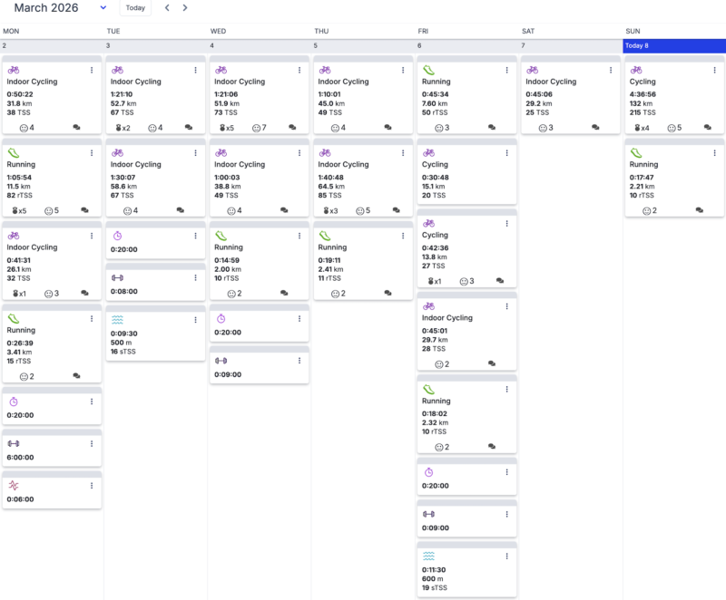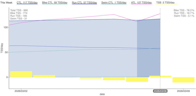 城里練習会の前日土曜日だけは軽めにしたけど、それ以外の日は全て100TSS以上の練習が出来てたのでやっと通常練習の軌道に乗ってきた感じ。