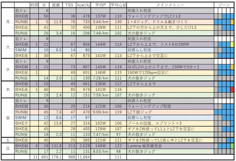 RUN:朝ランはL2下限ジョグ。ペースの上げ下げやドリルもしない本当にただのジョグ。雨も降らず風も吹かない日は久しぶり。気持ちよく走れた。45分:7.6km、Ave.6:00/km:119bpm/47rTSS。