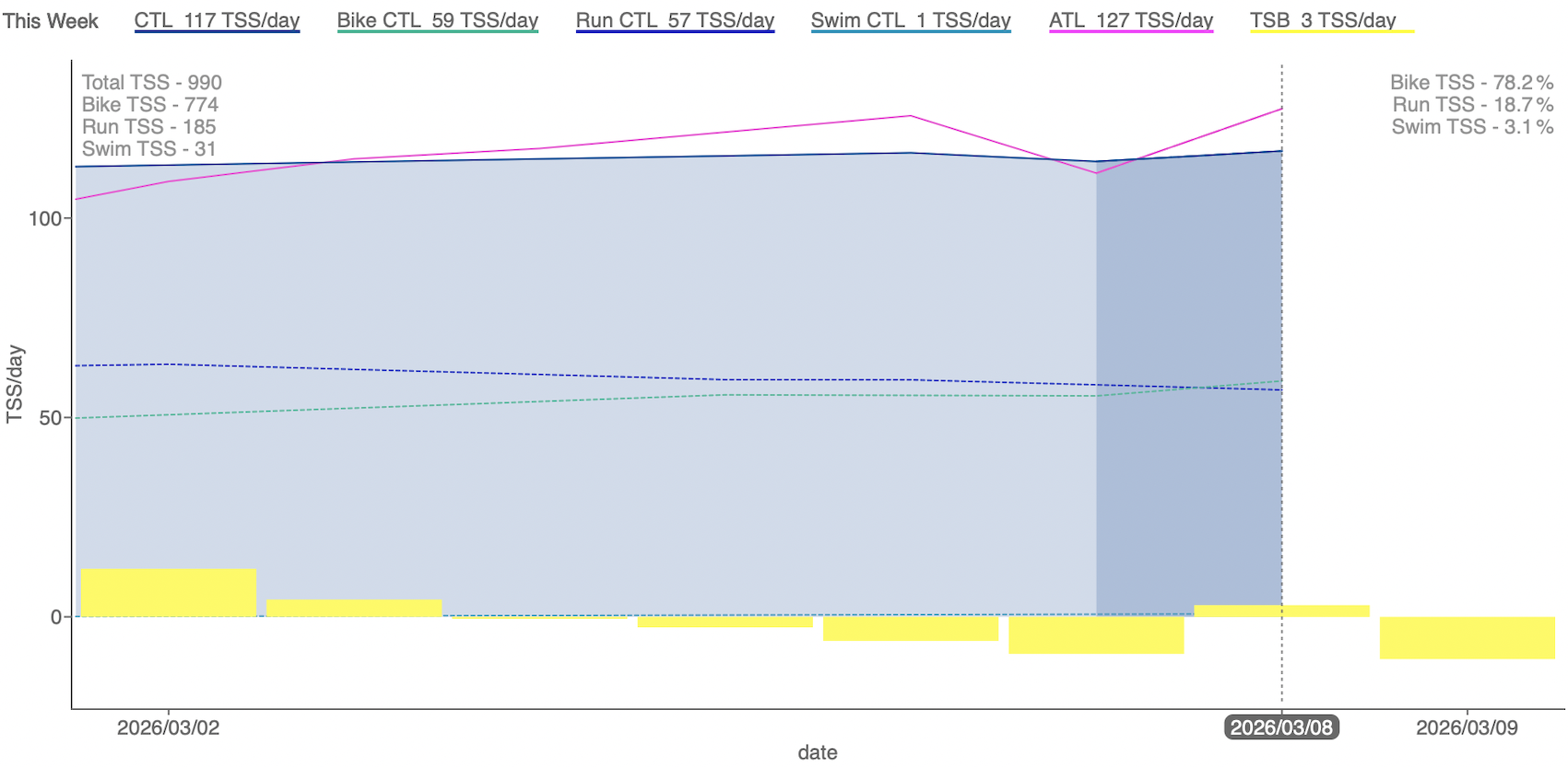 城里練習会の前日土曜日だけは軽めにしたけど、それ以外の日は全て100TSS以上の練習が出来てたのでやっと通常練習の軌道に乗ってきた感じ。