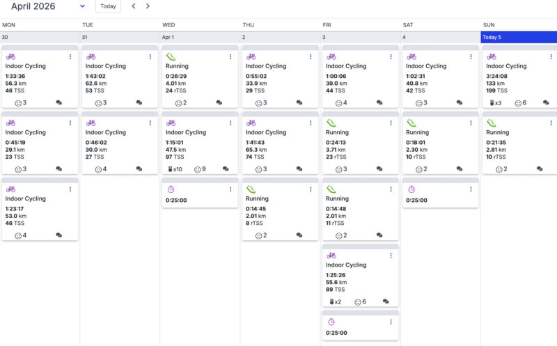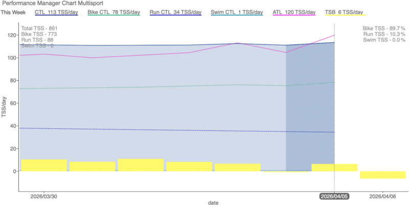 BIKE:朝ローラーは90分。練習と呼べるもほどのものではなく、ほぼL1、たまにL2に入るくらいでゆるゆる回す。心拍も100bpmを上回らない程度。これなら回復寄りの積み上げになるでしょう。93分、Ave.114W:97bpm/46TSS。
